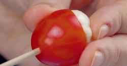 2) Mettez une boule de mozzarella dans la partie creusée et piquez un cure-dents. Cependant, le pic ne doit pas ressortir de l'autre côté.
