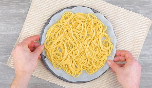 • Disposez une plaque de cuisson ronde (diamètre : environ 15 cm) avec du papier sulfurisé et étalez les spaghettis dessus. Mettez le plateau dans le four à 140 °C pendant 10 minutes, à chaleur tournante. Laissez les spaghettis refroidir un peu après.