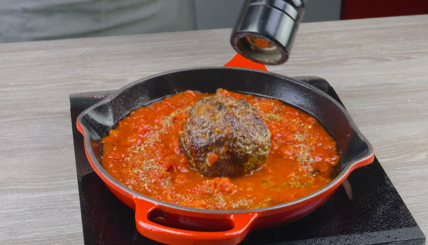 • Mélangez la viande hachée avec les oignons, l'ail, le sel, le poivre, les herbes et le pain sec. Formez une boule à partir du mélange et pressez un cube de fromage au milieu. Couvrez le cube de fromage avec plus de viande pour que la boule garde sa belle forme ronde. Faites frire la boule dans une poêle jusqu'à ce qu'elle soit cuite. Ajoutez les tomates concassées dans la poêle et assaisonnez avec de l'origan, du sel et du poivre. Laissez tout mijoter pendant environ 10 minutes.