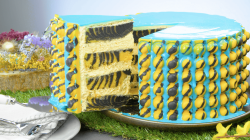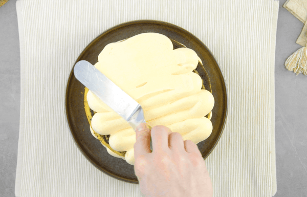 - Mélangez le fromage frais avec le sucre glace et le fixateur pour crème, puis incorporez la crème fouettée. Mélangez-la avec du colorant alimentaire jaune (la crème s'étale mieux si elle a été mise au frais 1 à 2 heures auparavant). Enduisez les parts de gâteau avec la crème au fromage frais et empilez-les les unes sur les autres. Enduisez entièrement le gâteau de crème.