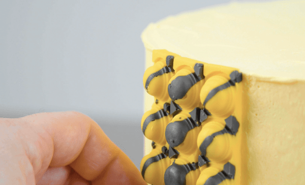 - Versez le chocolat noir en bandes sur un moule pop-it. Laissez-les durcir pendant environ 2 minutes, puis remplissez complètement le moule avec le chocolat jaune. Placez le moule au réfrigérateur pendant 2 heures. Retirez délicatement les barres solidifiées du moule. Pressez-les ensuite sur le bord du gâteau. Placez le gâteau au frais pendant 60 minutes.