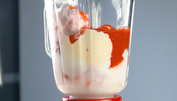 - Retirez le pédoncule des fraises et mettez les fruits dans un mixeur. Ajoutez le sucre, la pulpe de vanille, le lait, la glace à la vanille et à la fraise et le coulis de fraise et mélangez jusqu'à l'obtention d'une consistance crémeuse.