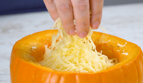 - Versez ensuite l'ail finement haché, la crème et le fromage râpé dans la citrouille et enfournez pendant 20 à 30 minutes supplémentaires. Remuez le fromage fondu toutes les 5 minutes.