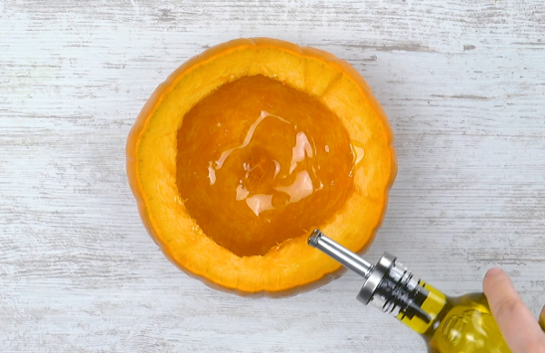 - Découpez la partie supérieure de votre citrouille (1 à 2 cm d'épaisseur). Ensuite, évidez la citrouille et placez-la sur une plaque de cuisson. Saupoudrez le tout d'huile d'olive et assaisonnez de sel et de poivre. Mettez la citrouille au four à 200 °C, pendant environ 20 à 30 minutes.