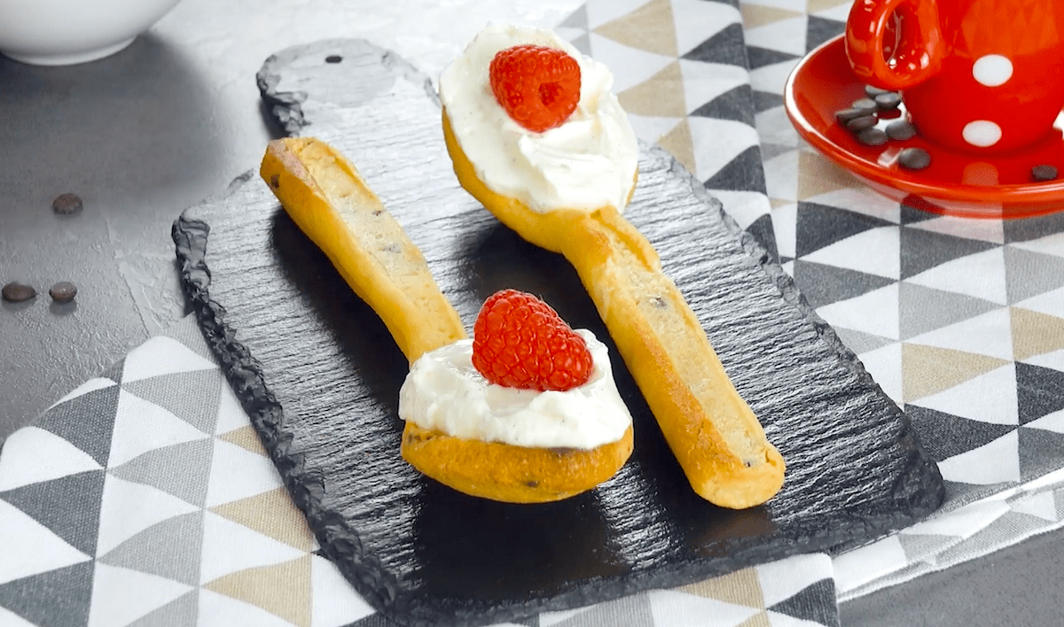 Les cookies ne sont pas seulement populaires aux États-Unis. Ces délicieux biscuits aux pépites de chocolat, délicieusement croustillants à l’extérieur et moelleux à l’intérieur. Aujourd’hui, ils existent dans toutes sortes de variantes, par exemple, avec des noix de macadamia, du chocolat blanc ou noir, de la noix de coco, etc. De notre côté, nous préférons la version simple avec des pépites de chocolat noir, mais avons décidé d’être créatifs avec la forme. Nous allons préparer des cuillères comestibles, des roulés et des tartelettes en pâte à cookies que nous remplissons avec une crème au fromage frais à la vanille.