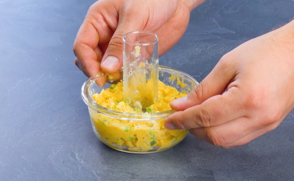 - Placez un verre à liqueur dans une petite coupelle en verre et verse le Mac and Cheese dans la coupelle sur une hauteur d'environ 3 cm autour du verre à liqueur. Congelez le tout pendant une heure.