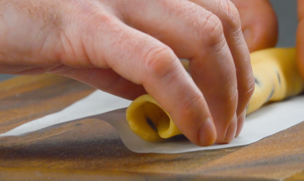 - Façonnez la pâte à biscuits en petits roulés minces (étalez d'abord, puis roulez). Laissez-les refroidir ensuite. Placez les roulés dans le four à 180 °C pendant 30 minutes, à chaleur tournante. Conseil : mettez un bâtonnet en bois dans la pâte pour qu'elle garde sa forme de rouleau. Après la cuisson, retirez le bâtonnet en bois de la pâte pendant qu'elle est encore chaude. À l'aide d'une poche à douille, incorporez la crème dans les roulés de pâte (mais ils doivent être complètement refroidis auparavant).
