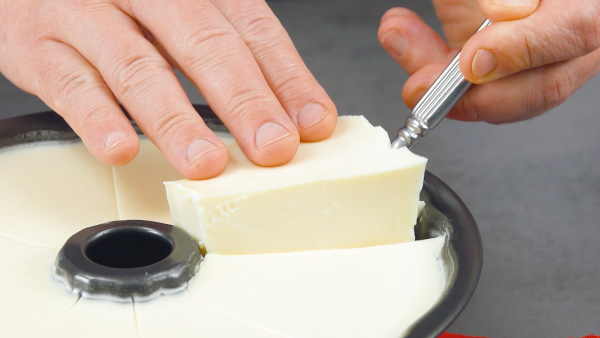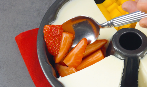 - Lorsque la gelée à la vanille a pris, coupez-la en 8 morceaux avec un couteau dans le moule et démoulez un morceau sur deux. Remplissez les espaces vides avec des fruits.