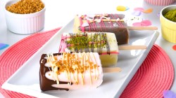 - Insérez des bâtonnets de crème glacée dans les briques de boisson lactée et mettez-les au congélateur pendant 3 à 4 heures. Ensuite, coupez les briques pour obtenir vos glaces. Faites fondre les chocolats, préparez le glaçage et décorez les glaces sur bâtonnet avec ces derniers et avec les garnitures pendant que les chocolats sont encore liquides.