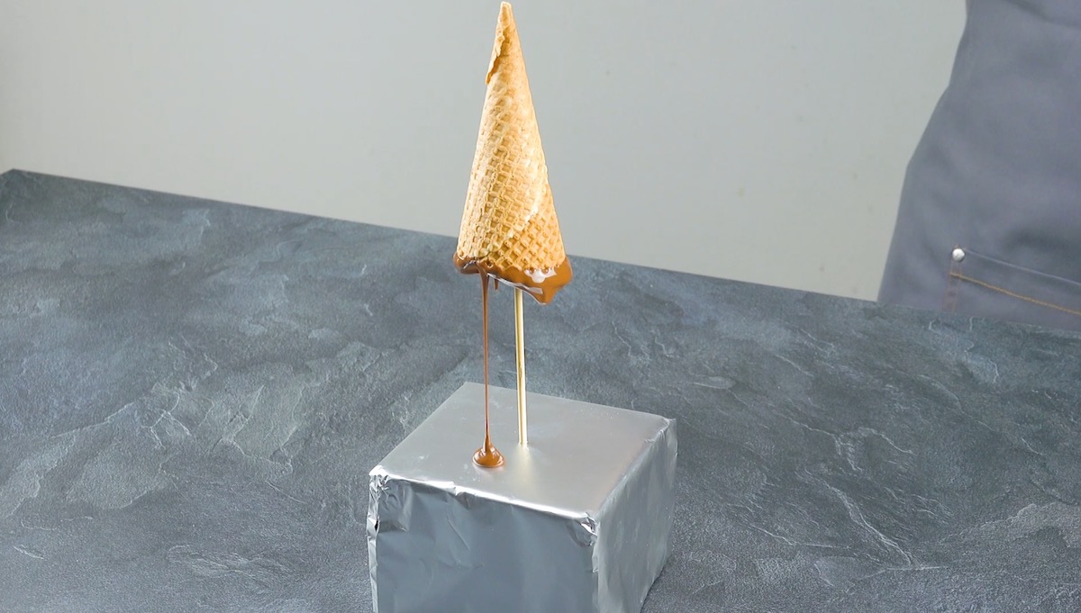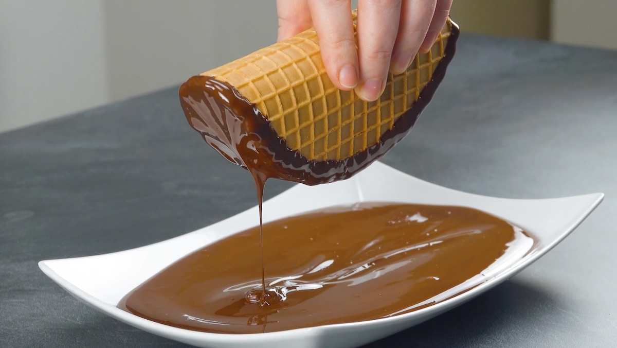3.1 Faites fondre le chocolat au bain-marie et versez-en un peu dans le cornet de glace. Tournez la gaufrette d’avant en arrière pour que l’enrobage de chocolat se répartisse uniformément à l’intérieur du cornet puis plongez les bords dans le chocolat. Déposez le cornet sur une brochette et laissez le chocolat sécher ainsi (photo ci-dessous).