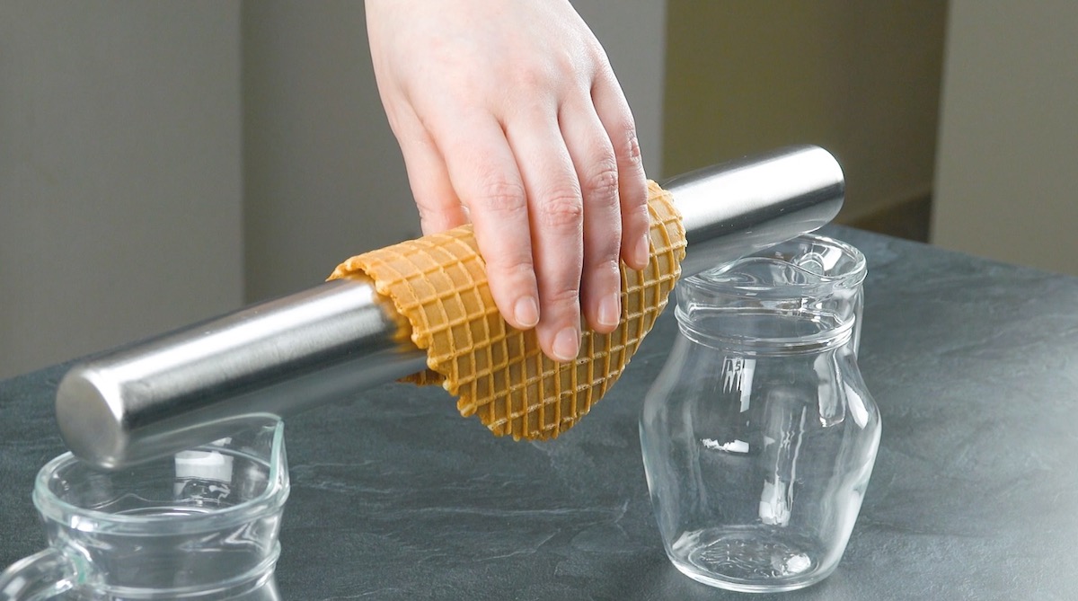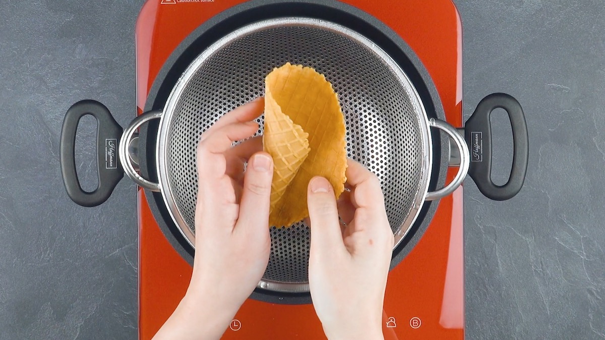 1.1 Faites bouillir de l’eau dans une casserole. Accrochez-y ensuite une passoire en veillant à ce qu’elle ne touche pas l’eau. Humidifiez deux morceaux d’essuie-tout et insérez un essuie-tout dans chaque cornet de glace. Faites cuire les gaufres à la vapeur l’une après l’autre pendant 2 à 3 minutes chacune ; retirez l’essuie-tout et déroulez soigneusement les cornets.