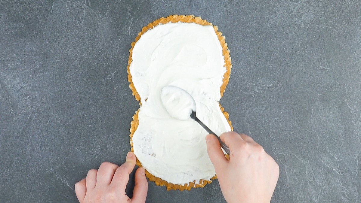 1.2 Mélangez le sucre glace et le fromage frais pour obtenir une crème. Placez les gaufrettes déroulées sur le plan de travail, en les faisant se chevaucher légèrement, et étalez la crème au fromage frais dessus, comme montré ci-dessous.