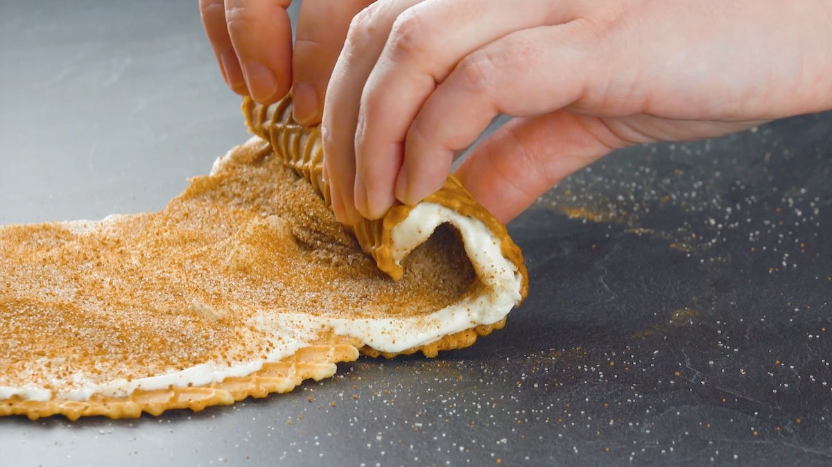 1.3 Mélangez la cannelle et le sucre et répartissez le mélange uniformément sur le fromage frais. Ensuite, roulez les gaufres ensemble.