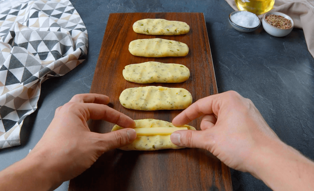 3.2 Aplatissez délicatement les boules, déposez une bande de fromage sur chaque portion puis formez des bâtonnets à partir de cette combinaison.