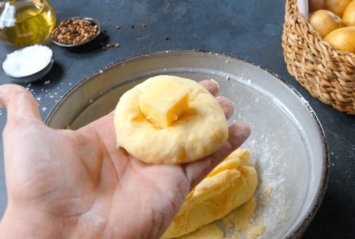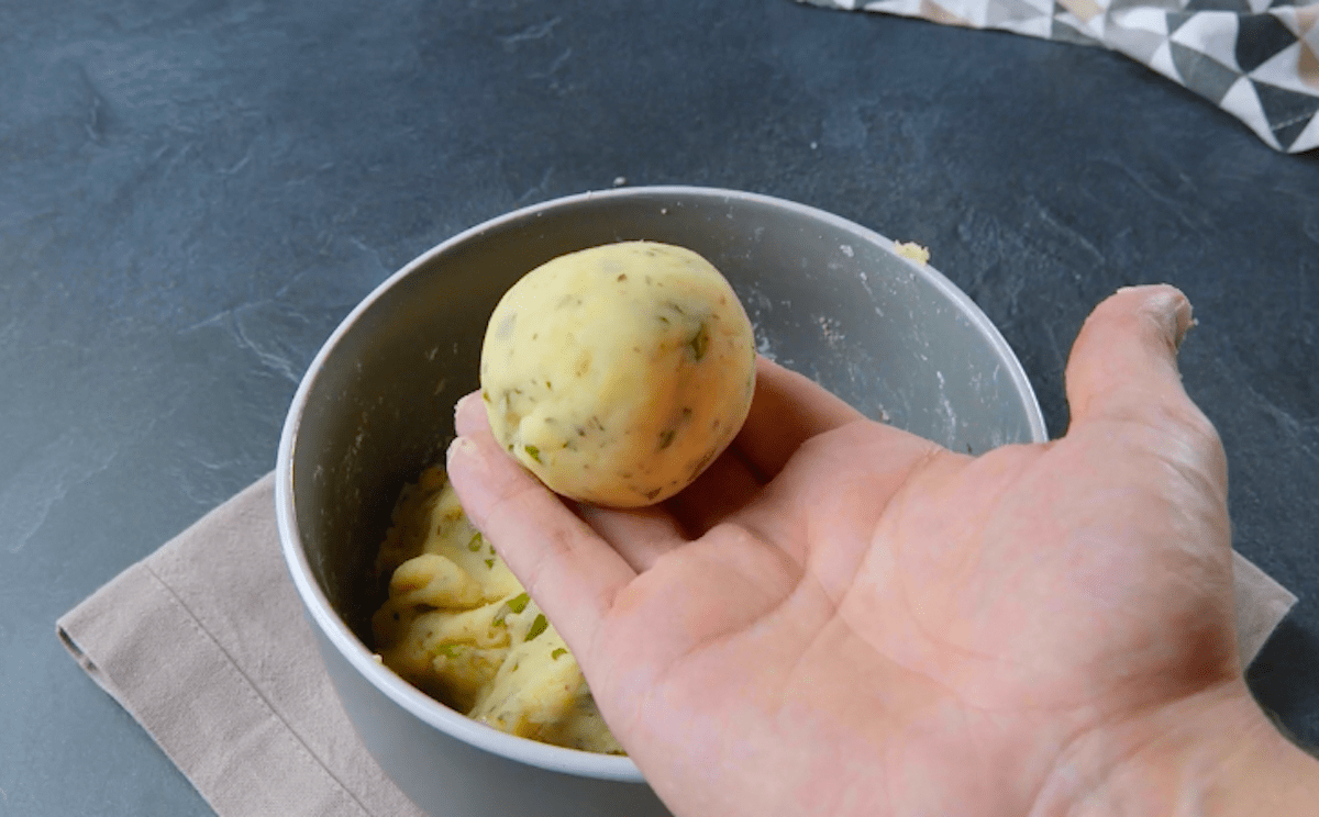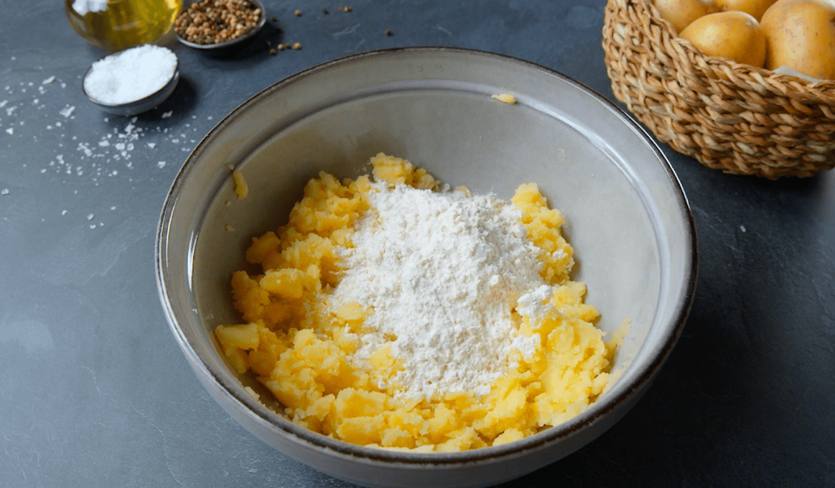 2.1 Écrasez les pommes de terre et mélangez-les avec la farine et le sel. Divisez le mélange en cinq portions égales.