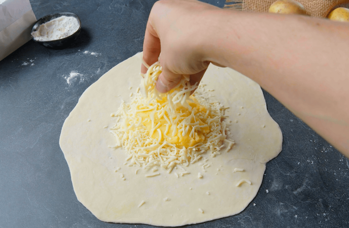 1.2 Mettez la moitié du fromage râpé sur la pâte étalée et répartissez la purée de pommes de terre au milieu du fromage. Saupoudrez ensuite le fromage restant sur les pommes de terre.
