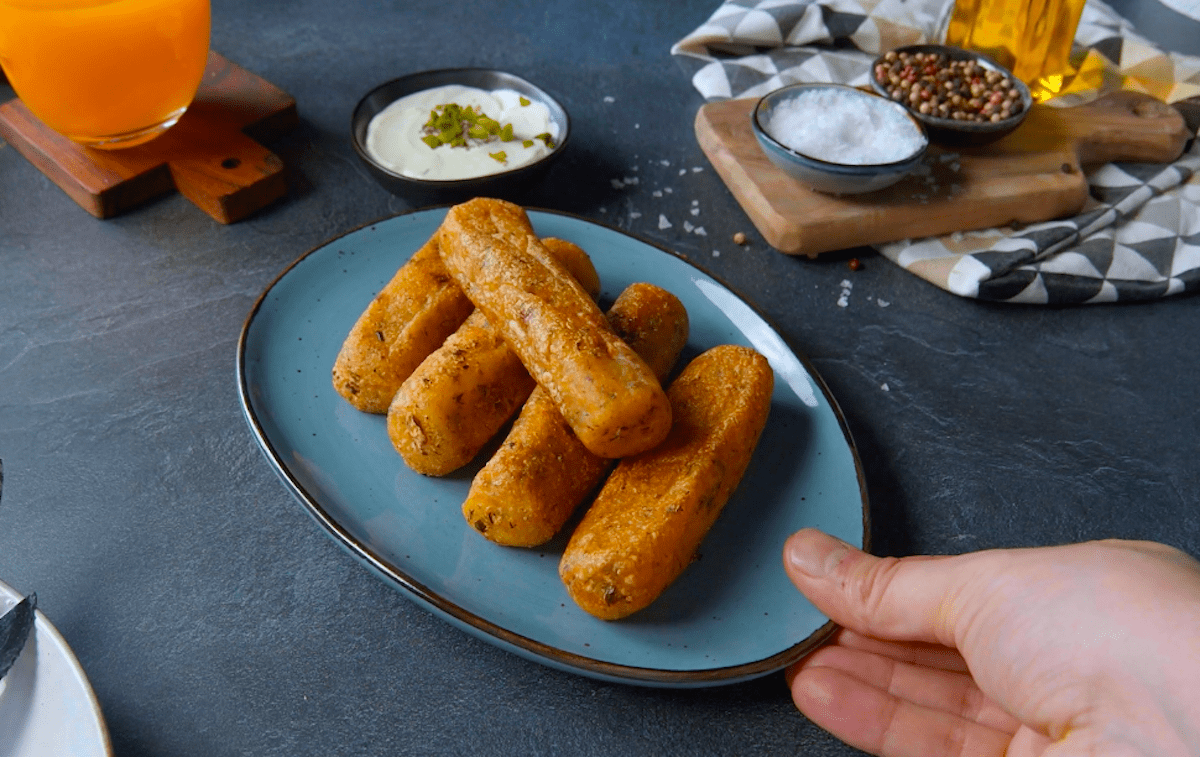 3.3 Faites frire les bâtonnets de pomme de terre dans l’huile à environ 170 °C jusqu’à ce qu’ils soient dorés et servez avec de la crème aigre.
