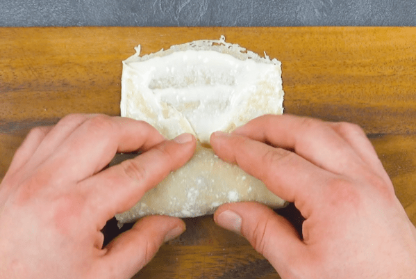 - Mélangez la farine et l'eau de manière à obtenir une sorte de pâte qui servira de colle. Répartissez cette colle sur le dessus de la feuille de pâte. Ensuite, repliez les côtés de la feuille de pâte vers le milieu et roulez le tout en un petit rouleau serré (pas trop serré, sinon la pâte peut se déchirer).