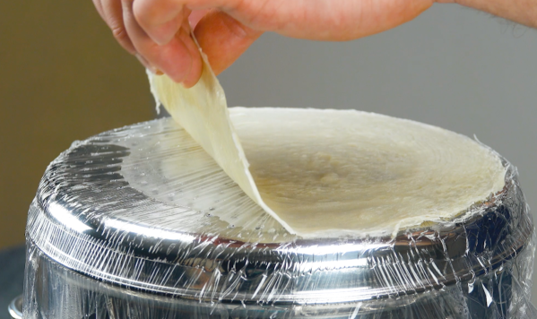 - Appliquez la pâte avec un pinceau en deux couches fines sur le film alimentaire. Laissez cuire la pâte jusqu'à ce qu'elle ne colle plus puis retirez-la délicatement de la passoire. Enveloppez la pâte dans un torchon légèrement humide, sinon elle deviendra sèche et cassante. Laissez la pâte refroidir.
