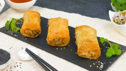 - Faites frire les nems dans de l'huile chaude (160 °C) jusqu'à ce qu'ils soient dorés (environ 2 à 3 minutes). Laissez-les refroidir brièvement et servez-les avec de la sauce soja ou de la sauce épicée sucrée.