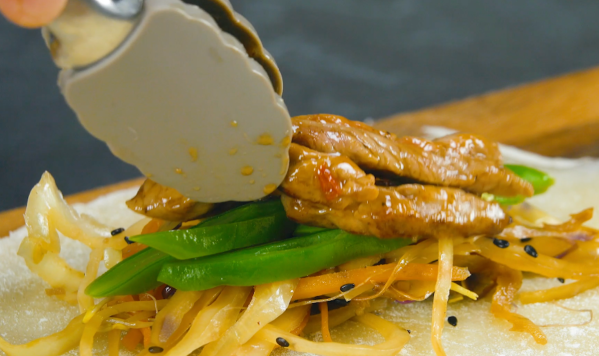 - Mettez les feuilles de pâte refroidies sur une planche et recouvrez la partie inférieure d'environ 2 cuillères à soupe du mélange de légumes asiatiques. Ajoutez les garnitures supplémentaires respectives. D'abord, les haricots et le bœuf frit coupé en lanières.