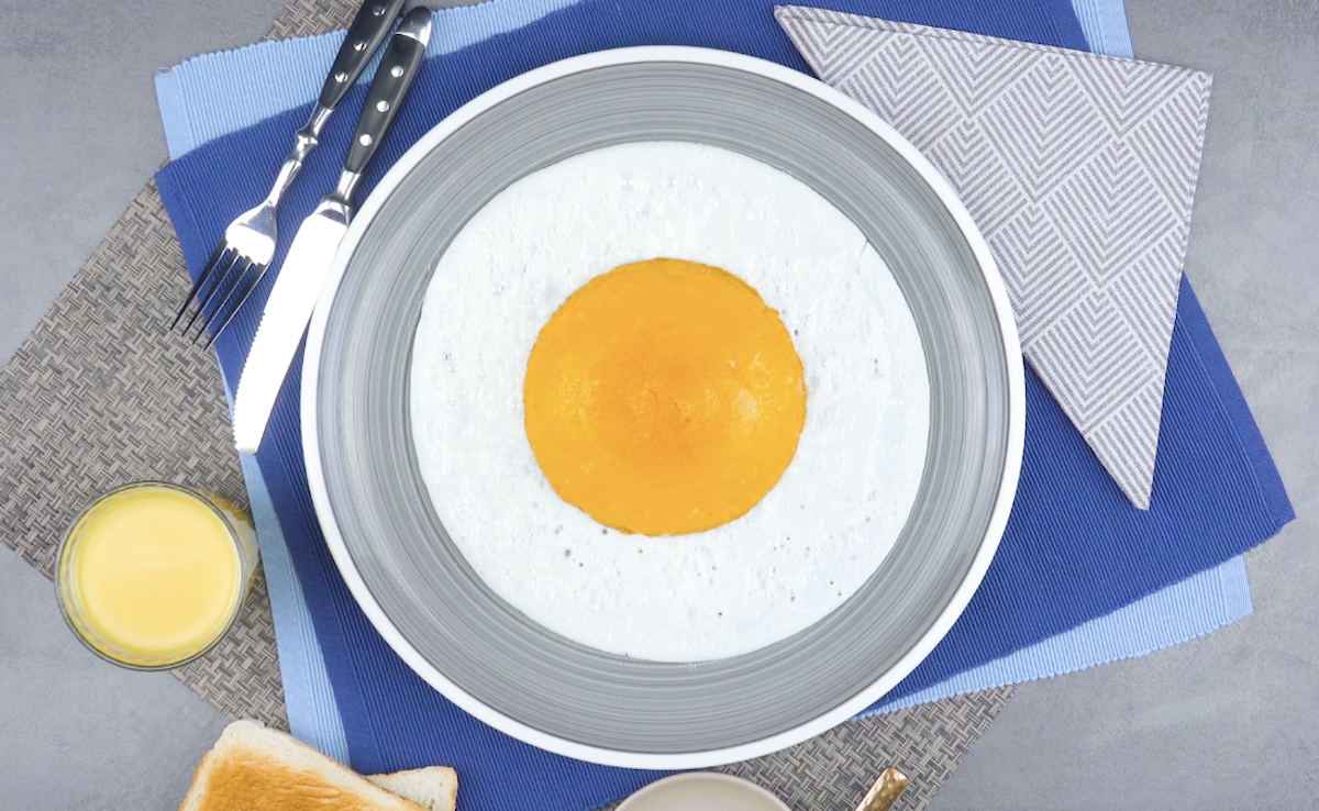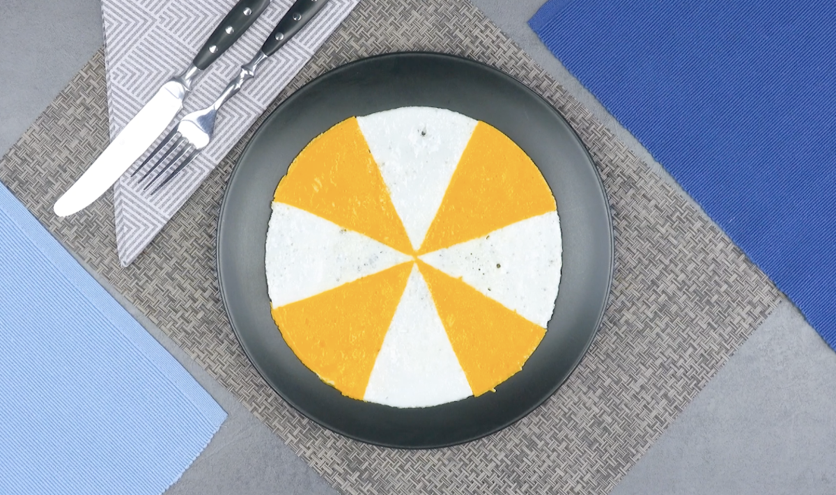 1.3 Versez le jaune d’œuf entre les segments de blanc d’œuf dans la poêle et attendez qu’il se solidifie. Retirez délicatement l’omelette colorée de la poêle et posez-la sur une assiette. Il ne vous reste plus qu’à déguster.