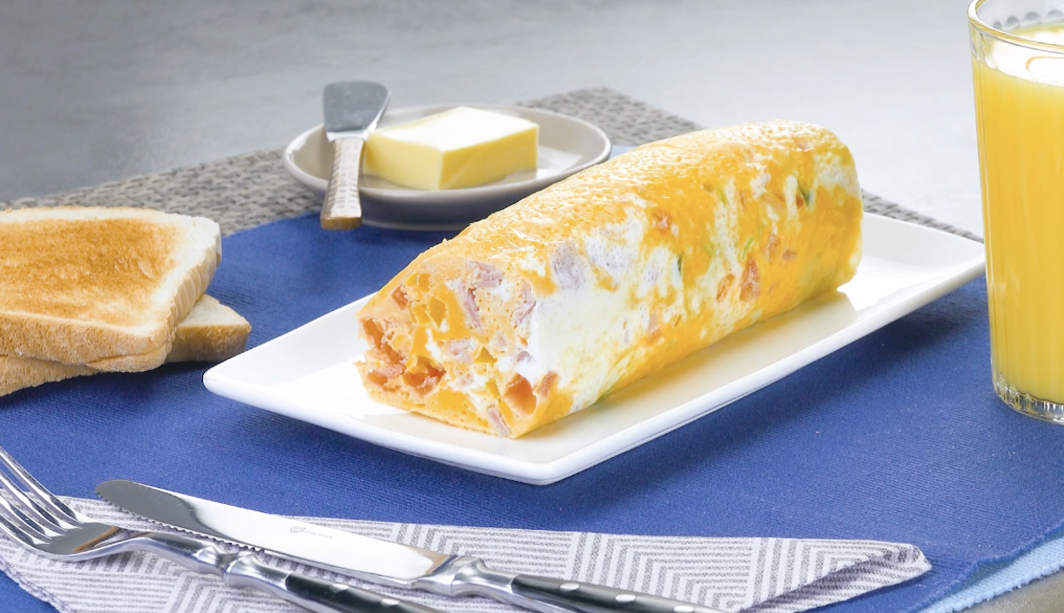 3.3 Coupez les extrémités et servez le roulé d’omelette sur une assiette.