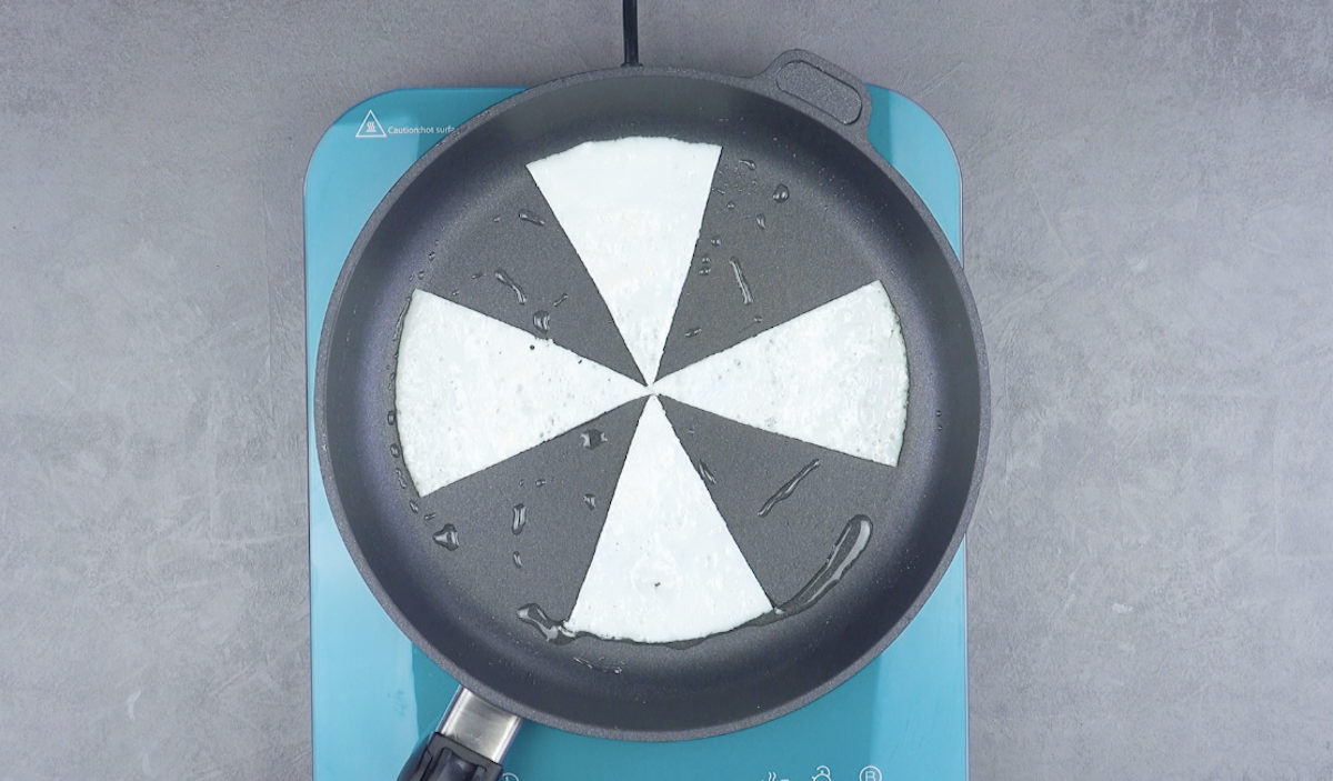 1.2 Dès que les blancs d’œufs ont pris, faites-les glisser délicatement de la poêle sur une planche à découper. Découpez le blanc d’œuf en 8 parties à l’aide d’une roulette à pizza et remettez 4 d’entre elles dans la poêle en les espaçant régulièrement.