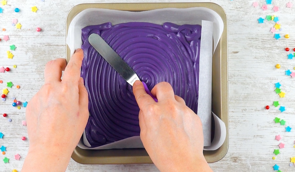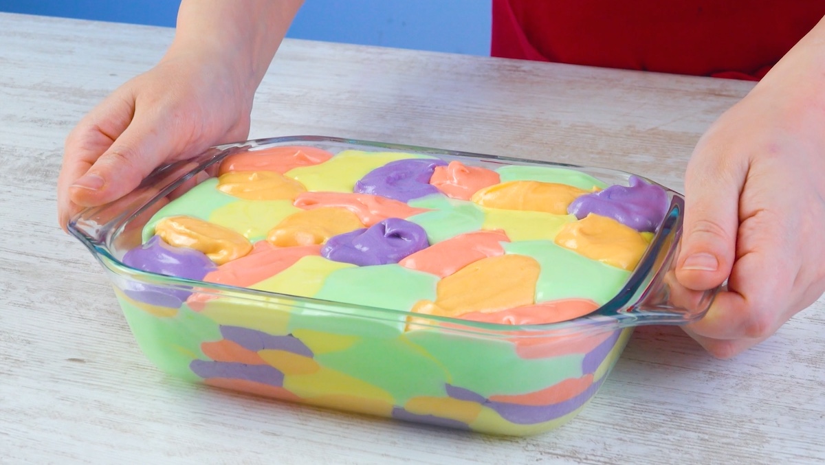 1.3 Remplissez le moule en alternant les masses de manière à obtenir un motif coloré. Recouvrez le plat de papier sulfurisé et mettez le tout au congélateur pendant au moins 6 heures, de préférence toute la nuit.