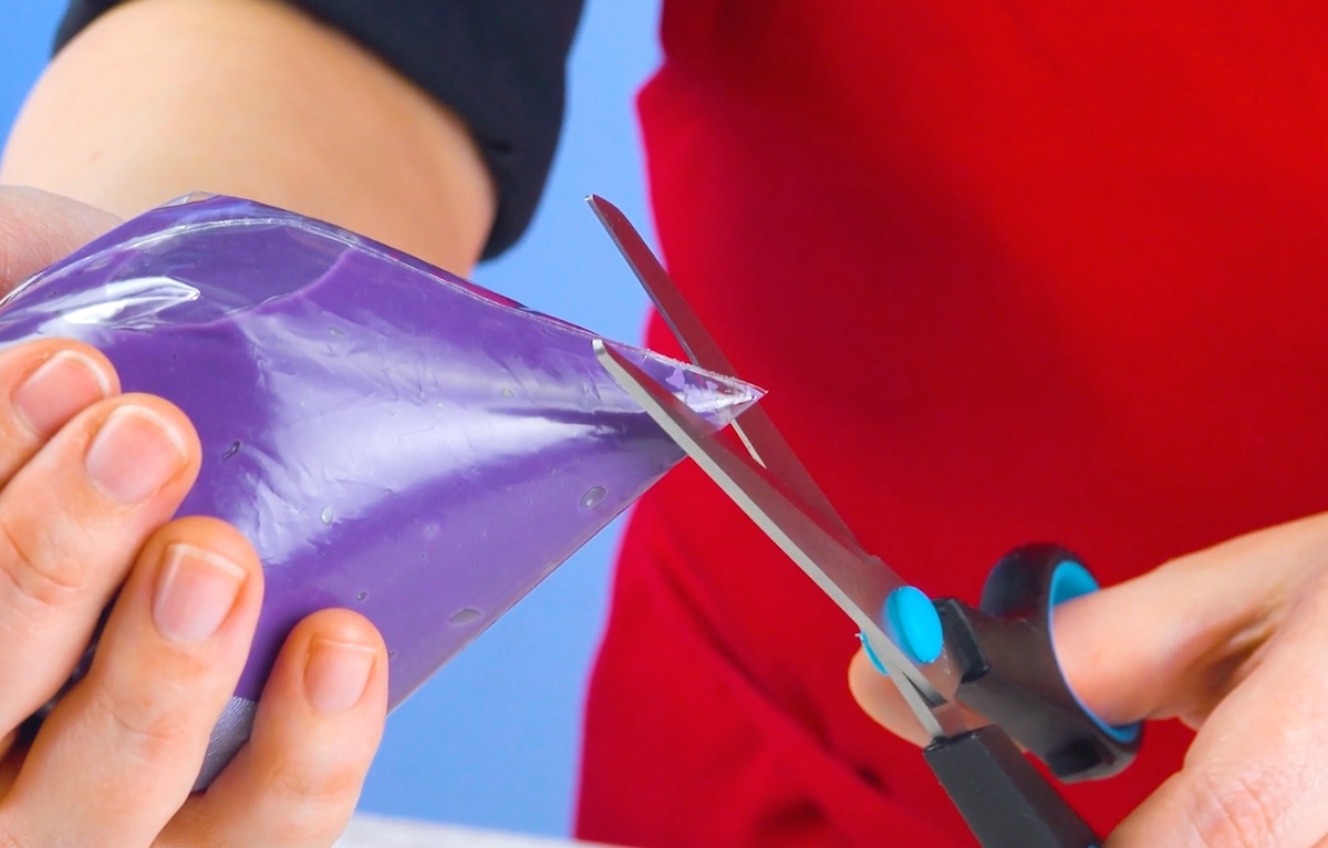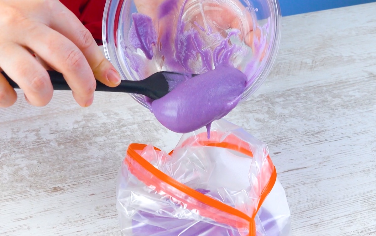3.2 Répartissez la masse uniformément dans 6 bols et teintez chaque masse différemment. Versez ensuite les masses colorées dans un sachet refermable. Découpez ensuite un des coins inférieurs de chaque sachet.