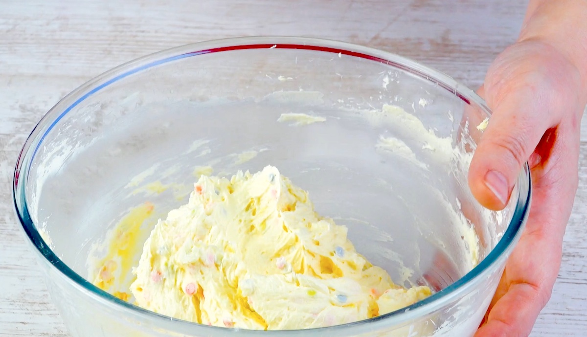 2.4 Pour la crème au beurre, commencez par battre le beurre mou en mousse. Incorporez ensuite le lait concentré et, pour finir, les confettis de sucre.