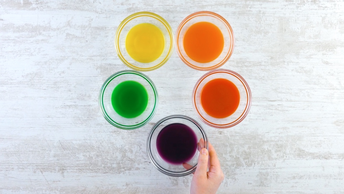 1.1 Faites chauffer 75 ml d’eau et dissolvez les Skittles d’une couleur dans cette eau en remuant. Répétez l’opération pour les autres couleurs. Laissez ensuite refroidir les portions d’eau colorées.