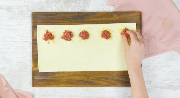 - Étalez la pâte feuilletée et déposez cinq petits tas de fromage râpé sur une moitié. Recouvrez chaque tas de fromage d'un peu de viande hachée.