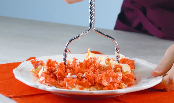 - Écrasez la part de gâteau jusqu'à obtenir une pâte homogène et malléable. Si la pâte à gâteau pure est trop sèche, vous pouvez y ajouter par exemple de la confiture, du fromage frais ou de la crème au beurre. Faites également fondre le chocolat blanc.