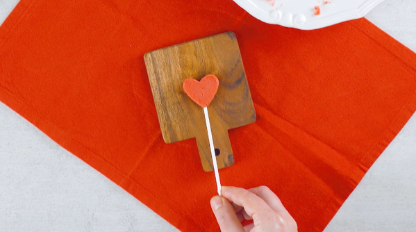 - Mettez un peu de pâte dans l'emporte-pièce en forme de cœur. Retirez ensuite l'emporte-pièce et enfoncez un bâtonnet de sucette dans le cœur. Trempez d'abord le bâtonnet dans le chocolat fondu, il tiendra mieux dans le cœur de cette façon.