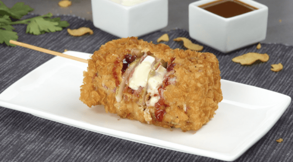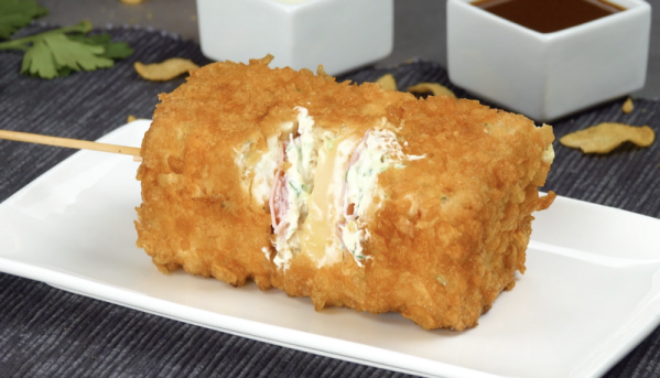 - Préparez d'abord 4 petites omelettes et faites griller les 5 tranches de pain de mie. Tartinez une tranche de pain avec du fromage aux herbes. Mettez une tranche de jambon, une petite omelette et une tranche de fromage par-dessus. Ensuite, étalez du fromage aux herbes sur un autre toast et posez-le à l'envers sur le reste. Continuez à empiler le reste jusqu'à ce que tous les ingrédients aient été utilisés.Plantez 4 brochettes dans la tour de sandwich et coupez 4 morceaux de taille égale. Tournez les brochettes d'abord dans l'œuf battu puis dans les corn flakes écrasés. Ensuite, faites-les cuire dans de l'huile chaude.