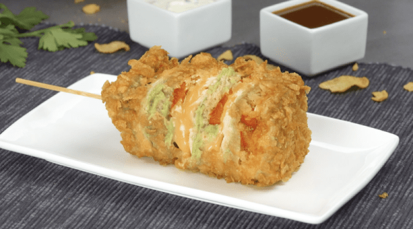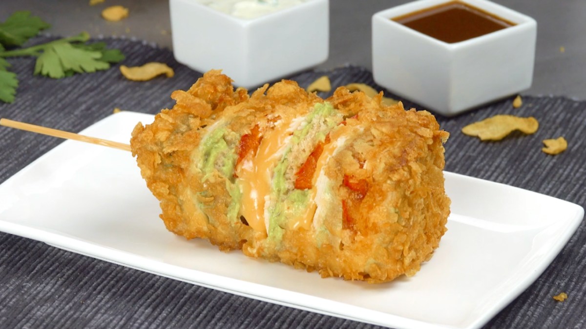- Faites griller les 5 premières tranches de pain de mie complet. Placez une tranche de pain devant vous et tartinez-la de crème d'avocat. Posez ensuite 2 tranches de blanc de poulet, 1 tranche de cheddar et 2 tranches de poivron rouge par-dessus.Ensuite, étalez un autre toast de grains entiers avec de la crème d'avocat et posez-le à l'envers sur le reste. Étalez la crème de l'autre côté et empilez le tout l'un après l'autre jusqu'à épuisement des ingrédients.Plantez 4 brochettes dans la tour de sandwich et coupez 4 morceaux de taille égale. Tournez les brochettes d'abord dans l'œuf battu puis dans les corn flakes écrasés. Ensuite, faites-les cuire dans de l'huile chaude.