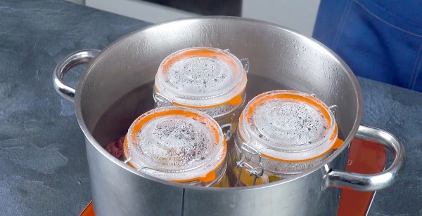 - Recouvrez le fond d'une casserole avec un torchon, placez les bocaux dessus et remplissez la casserole aux trois quarts avec de l'eau. Fermez la casserole et faites chauffer l'eau, en réduisant la température dès que l'eau commence à bouillir. Laissez ensuite les bocaux cuire pendant trois heures, à couvert, dans de l'eau frémissante.
