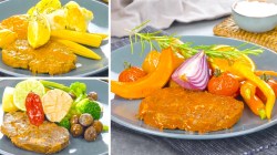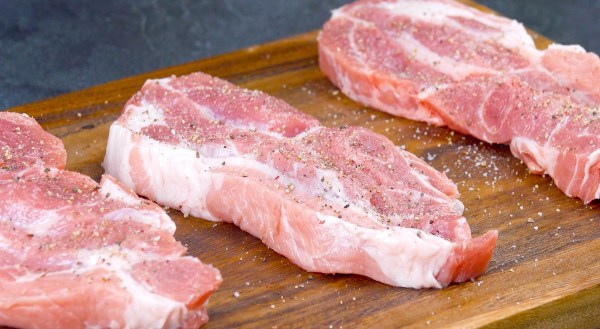 - Coupez l'échine de porc en trois tranches égales, salez et poivrez-les des deux côtés.