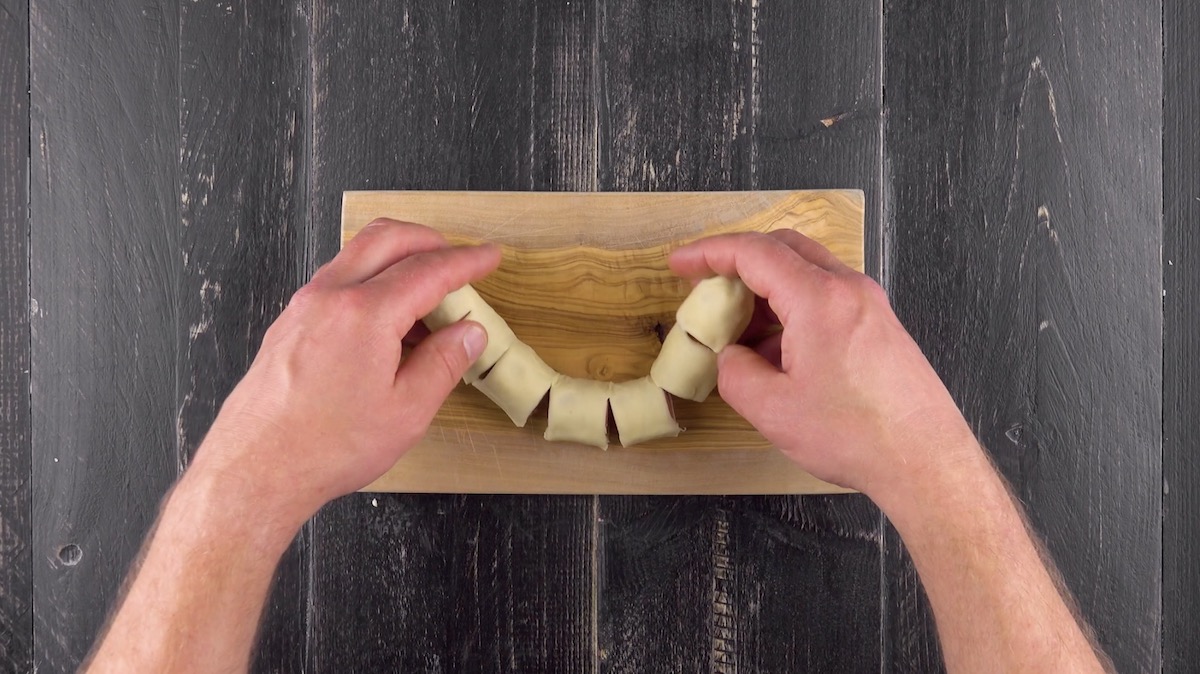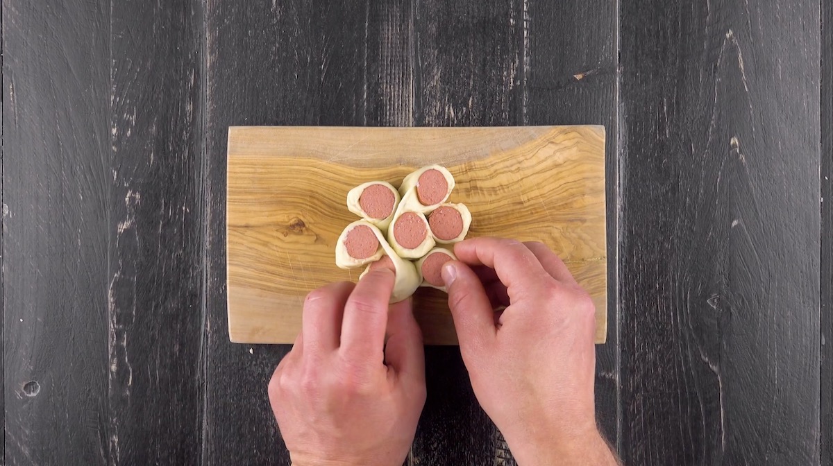 1.3) Maintenant, formez un cercle avec les saucisses. Tournez l’avant-dernier morceau de façon à ce qu’il coulisse vers le milieu.