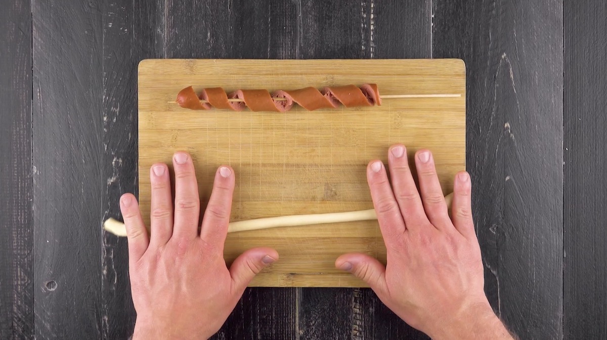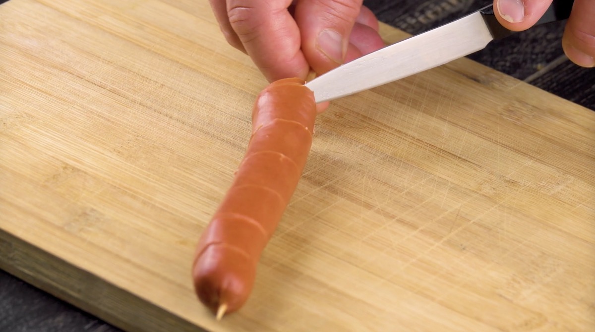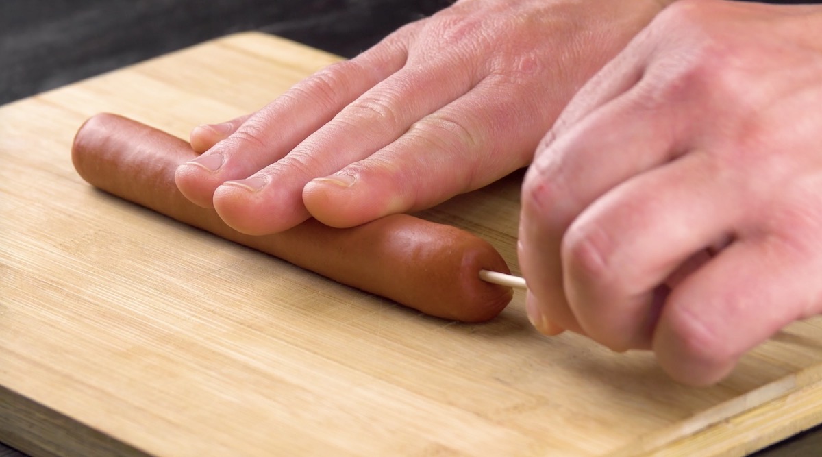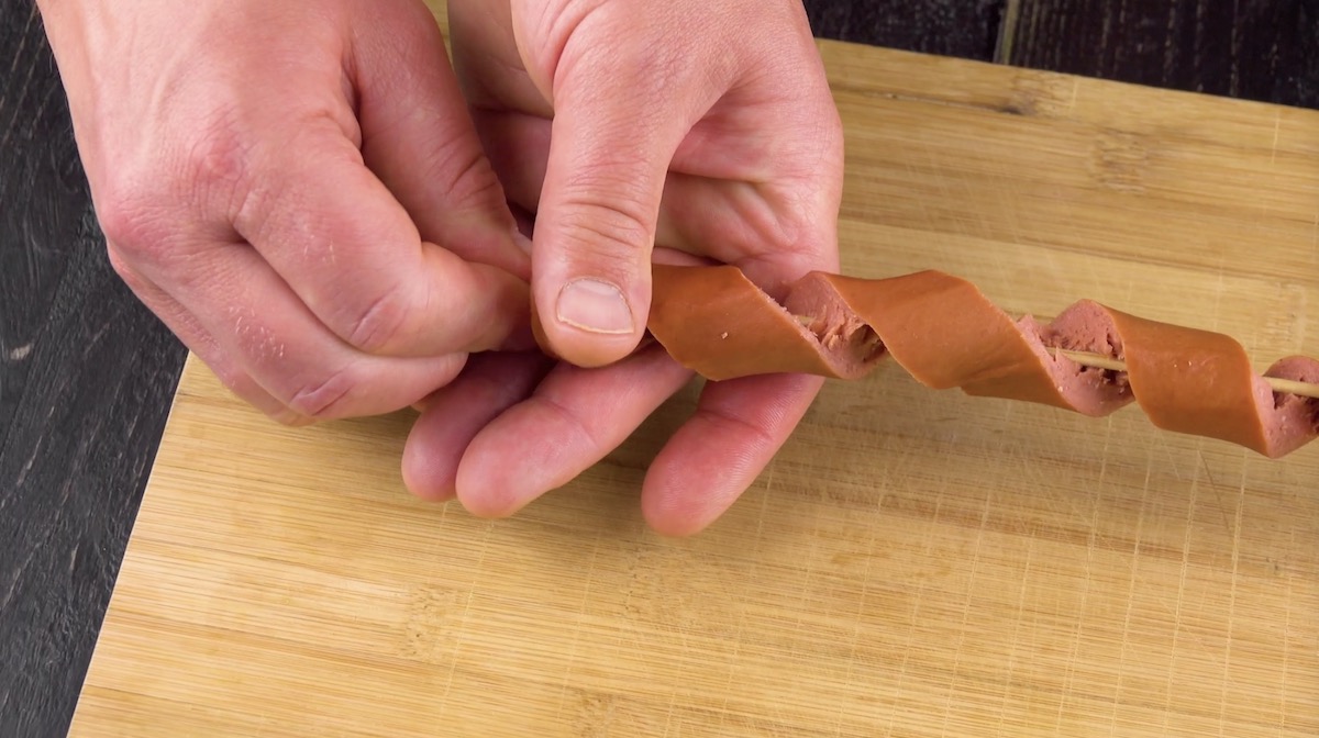 2.2) Coupez les saucisses en diagonale et tournez la brochette pour une incision en forme de spirale.
