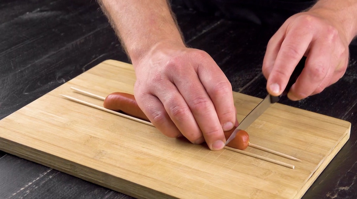 3.1) Placez les saucisses entre deux brochettes puis coupez-les en morceaux ; servez-vous des brochettes pour ne pas couper les saucisses entièrement.