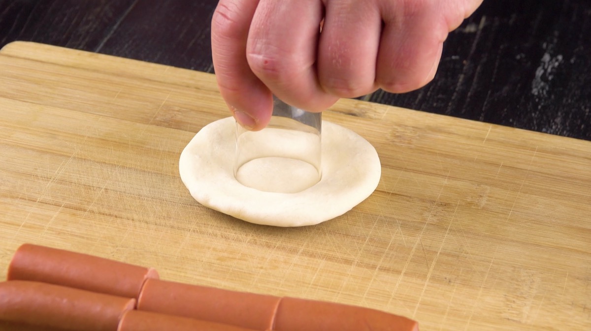 4.2) Pour chaque morceau de saucisse, formez un cercle avec environ 50 g de pâte à pizza et découpez le centre avec un petit verre ayant environ le diamètre d’une saucisse.