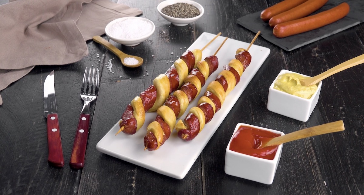 2.5) Enroulez la pâte autour de la saucisse en spirale. Enfournez-les pendant 15 minutes à 180 °C. Pratique, pas vrai ?