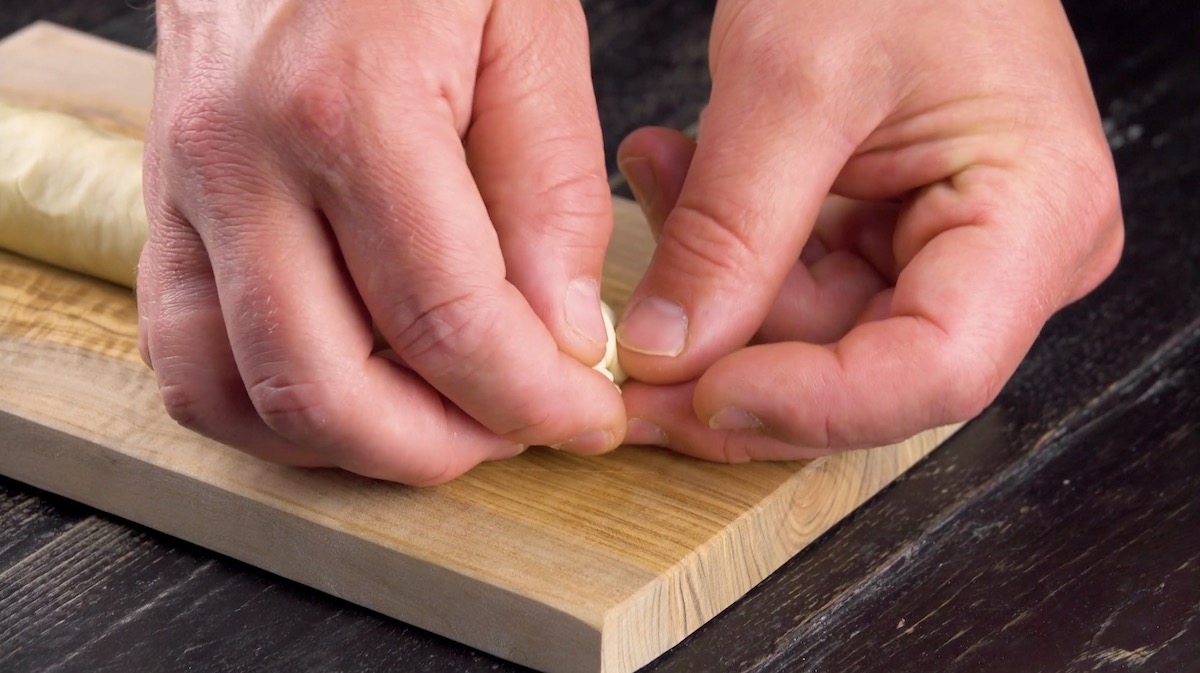 2.4) Coupez la pâte à pizza en fines lamelles et formez une “saucisse de pâte” à partir de chaque lamelle.