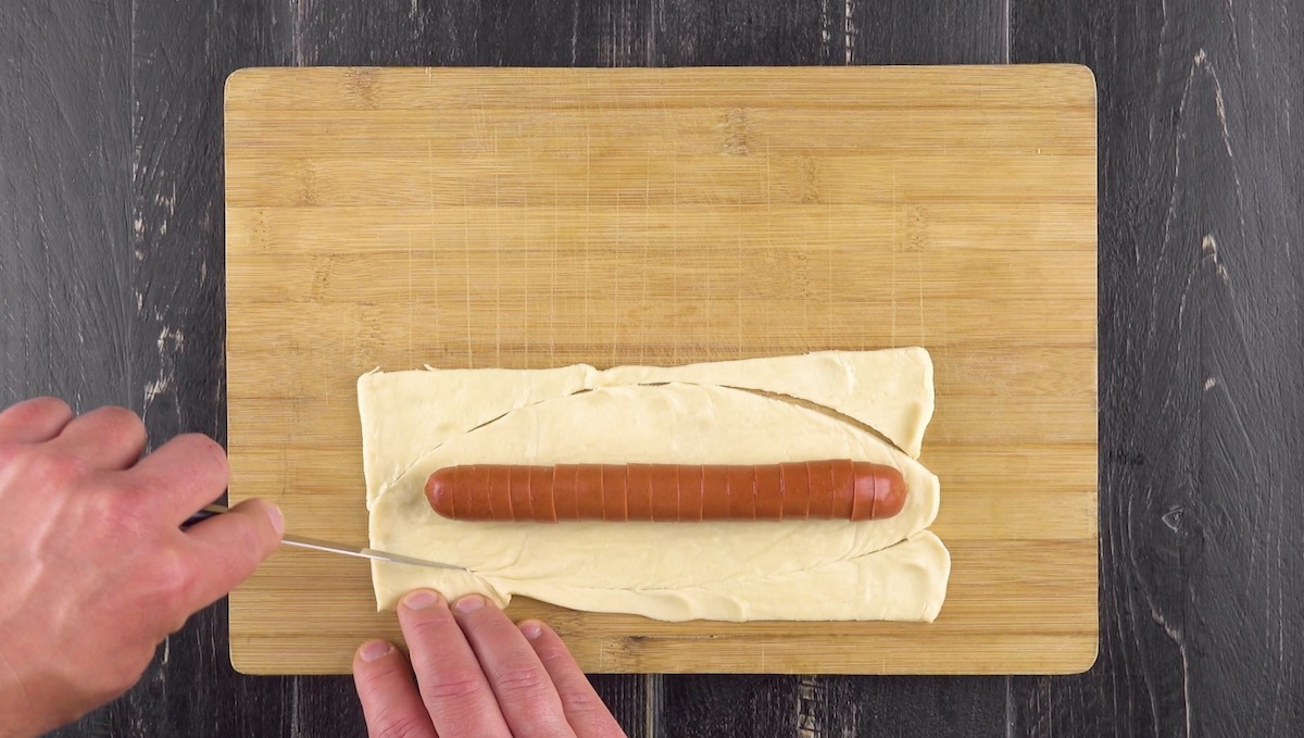 1.2) Coupez ensuite les saucisses en 6. Veillez à couper les saucisses complètement, mais pas toute la pâte.