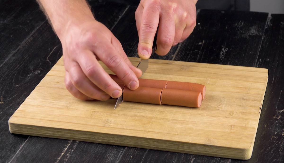 4.1) Retirez les extrémités des saucisses et coupez-les en trois morceaux identiques.