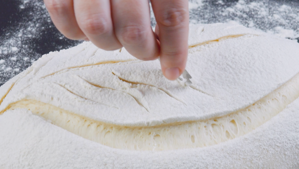 - Mettez de la farine sur le pâton levé et dessinez délicatement une feuille à la surface de la pâte avec l'incisette à pain (lame de rasoir). Placez un récipient rempli d'eau chaude ou bouillante dans le four préchauffé à 250 °C (chaleur tournante) et glissez le pain dans le four à mi-hauteur. Après environ 15-20 minutes, retirez le récipient d'eau du four et baissez la température à 180 °C. Faites cuire le pain pendant 20 minutes supplémentaires.