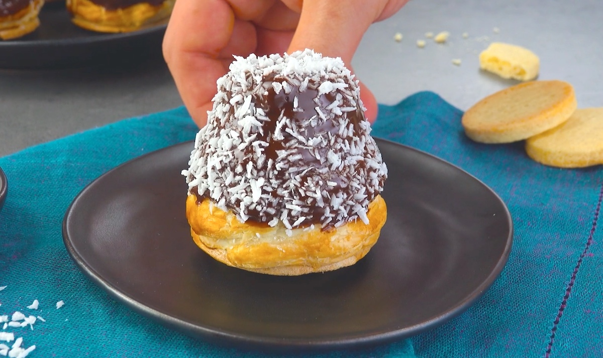 1.3 Faites fondre le chocolat et le beurre au bain-marie, puis trempez les éclairs de pâte feuilletée dans ce mélange et saupoudrez-les de flocons de noix de coco. C’est prêt !