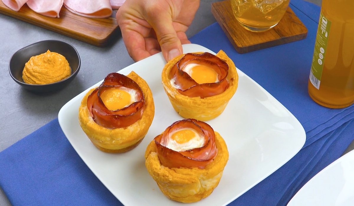 2.3 Coupez les tranches de jambon en deux et placez six d’entre elles à l’intérieur de la pâte feuilletée, les extrémités devant également se chevaucher. Déposez ensuite un œuf sur chaque mélange de pesto et de fromage frais.